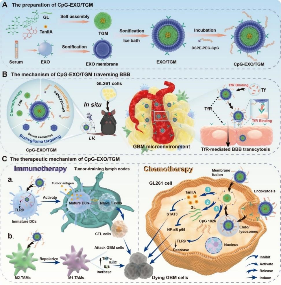由于血脑屏障(blood brain barrier, BBB)和血脑肿瘤屏障(blood brain tumor barrier, BBTB)的存在,大部分候选药物无法有效地蓄积在脑胶质瘤病灶部位。此外,免疫抑制微环境也是脑胶质瘤治疗的一大阻碍。因此,多策略联合克服胶质瘤的治疗阻碍至关重要。基于前期工作基础(Acta Pharmaceutica Sinica B. 2022, Journal of Controlled Release. 2022. 2023, Journal of Medicinal Chemistry. 2022, Journal of Nanobiotechnology. 2020),发现血清来源的外泌体(Exosome,EXO)表达有丰富的TfR,其可以通过与血液中游离的转铁蛋白结合,进而靶向大脑。由于EXO是内源性物质,所以相比于其它常用的纳米载体具有更低的免疫原性,并且能够逃避单核巨噬系统的吞噬,从而实现在体内的长循环。传统中药丹参中的脂溶性活性成分与甘草中的两亲性活性成分可通过自组装策略构建纳米胶束(TanⅡA-GL nano-micelles, TGM),同时发挥不同组分间的协同治疗作用。受EXO独特理化性质启发,团队将在EXO表面修饰了免疫佐剂CpG ODN 1826,成功构建了脑胶质瘤靶向及化疗、免疫治疗一体化的仿生纳米递送系统,用于递送纳米胶束(TGM),以“Immune Exosomes Loading Self-assembled Nano-micelles Traverse the Blood-brain Barrier for Chemo-immunotherapy Against Glioblastoma”为题发表于ACS Nano上。该研究制备所得荷载中药自组装胶束的“免疫外泌体”纳米粒,可以有效改善单一载体药物荷载量低、生物相容性差、靶向穿透力弱、治疗机制单一等问题,能够精准靶向脑胶质瘤病灶部位,通过化学疗法和免疫疗法协同治疗脑胶质瘤,在未来具有广阔的应用前景(Fig. 1)。