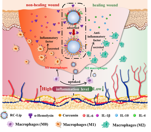 Fig.1. RC-Lips adsorb Hlα in the wound area with controlled release of the anti-inflammatory curcumin. Such dual effect of RC-Lips inhibits excessive wound inflammation, regulates the type of macrophage polarization, and promotes diabetic wound healing.