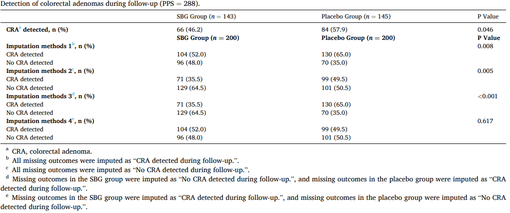 治疗两个疗程后,基于mITT人群的主要疗效分析结果显示,治疗组中71例患者有CRA复发,对照组中99例患者有CRA复发,治疗组的CRA复发率显著降低(OR:0.47,95% CI:0.29-0.74,P = 0.001)。在敏感性分析中,基于卡方检验的结果与主要疗效分析一致,治疗组的CRA复发率较对照组显著降低(P = 0.046)。在另一项敏感性分析中,除了最极端的情况外(治疗组的缺失结局填补为“随访期间均检测到CRA”,对照组的缺失结局均填补为“随访期间未检测到CRA”),其余三种结局填补方法的结果显示,治疗组的CRA复发率低于对照组,差异均具有统计学意义。此外,补充分析中Log-rank检验也表明,与对照组相比,治疗组的累积CRA复发风险显著降低(P = 0.003),并且治疗组的中位CRA检出时间较对照组明显延长(29个月VS. 24个月)。