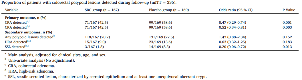在mITT人群中,治疗组在随访期间检出锯齿状病变的患者有3例,对照组中有14例患者发生锯齿状病变,检出率分别为1.8%和8.3%,治疗组发生锯齿状病变的患者比例显著低于对照组(OR:0.20,95% CI:0.06-0.72,P = 0.013),表明参白颗粒可以显著降低锯齿状病变的发生,对于减少息肉经锯齿状途径癌变的风险具有重要意义。