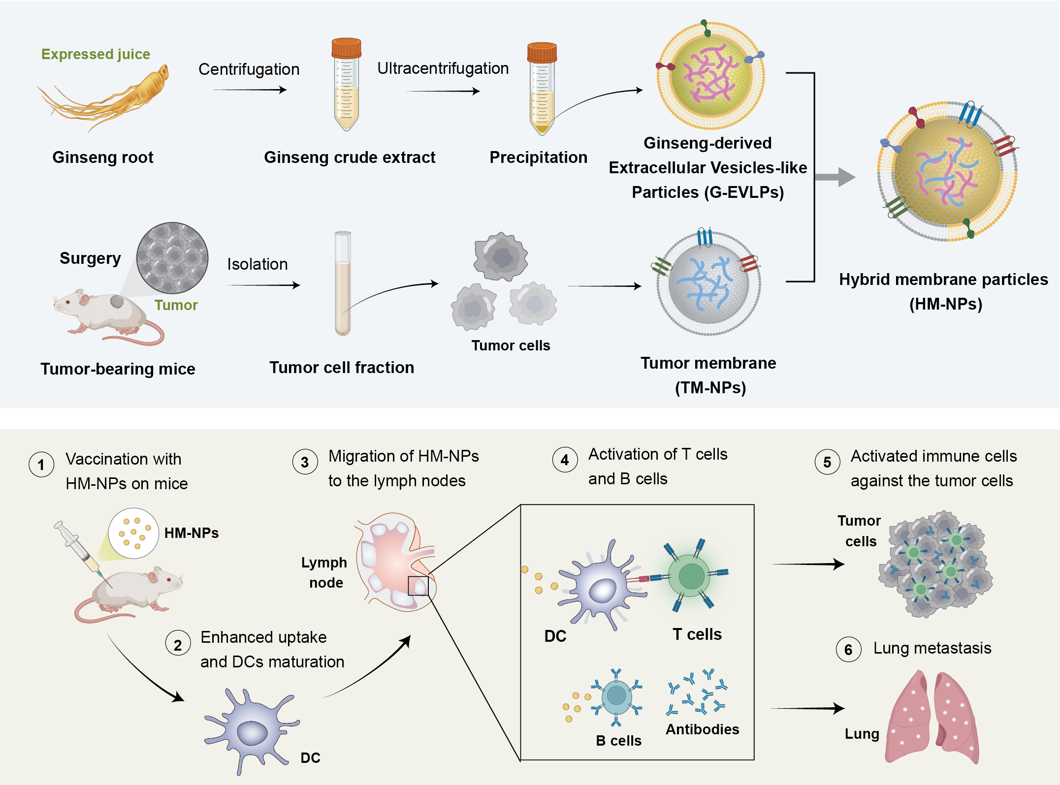 在追求更精确、更有效的治疗方式的推动下,个性化肿瘤治疗措施不断发展。个性化肿瘤疫苗可触发自体肿瘤特异性免疫记忆,是消除实体瘤术后的复发和转移,提供机体长期保护的高效方法。结合团队前期的研究基础(Journal for Immunotherapy of Cancer, 2019; Molecular Therapy, 2022; Journal of Experimental & Clinical Cancer Research, 2023),该研究提出了人参细胞外囊泡样颗粒(G-EVLPs)嵌合自体肿瘤抗原建立个性化肿瘤疫苗(HM-NPs)的概念,以增强树突状细胞(DCs)对于自体肿瘤抗原的吞噬,并通过TLR4促进DCs成熟,最终提供长期的肿瘤保护。这项工作展示了药食同源植物来源纳米颗粒嵌合的个性化肿瘤疫苗的独特优势和应用前景,为个性化疫苗设计及佐剂选择提供新的可能和视角,也在传统医学智慧和现代精准医学间架起了相互借鉴和融合的桥梁。