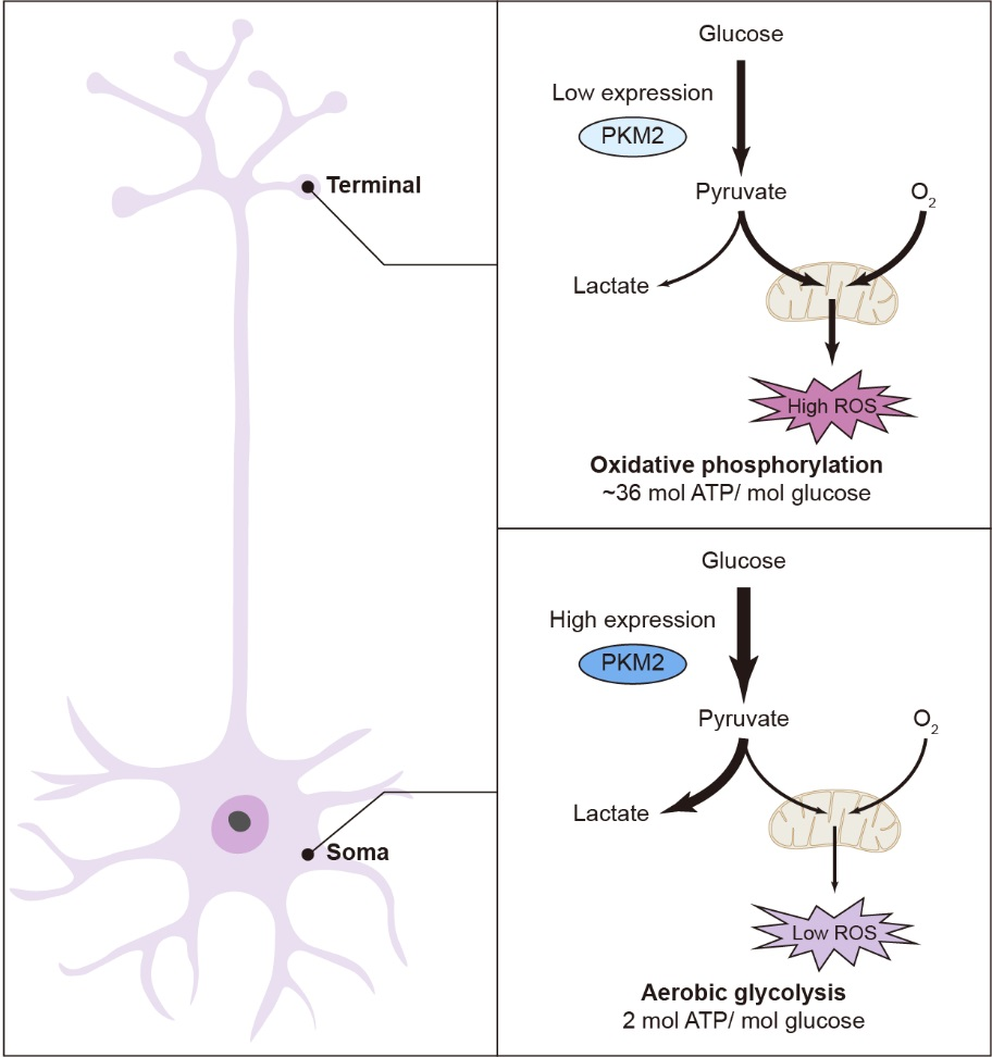 胡刚教授团队发现,神经元在胞体处主要采用有氧糖酵解,而在神经末梢处主要采用氧化磷酸化代谢。这种策略使得神经末梢能够高效地产生能量,支持神经递质释放与回收等高能耗功能。同时,神经末梢通过突触可塑性可以克服氧化磷酸化产生的活性氧带来的结构损伤。另一方面,胞体是神经元储存遗传物质与合成蛋白质的地方,因此对活性氧的防护尤为关键。不产生活性氧的有氧糖酵解对于胞体而言是一条更安全的糖代谢途径(图一)。这些研究发现提示,神经元以一种智慧的方式,在不同亚细胞结构处采用不同的糖代谢方式,既满足了能量需求,又避免了氧化损伤。本研究丰富了神经元耗能代谢方式的理论,为相关神经精神疾病的干预策略及其治疗药物研发提供了新的研究思路。