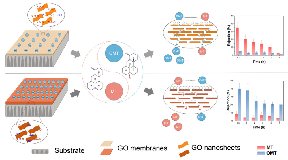 近日,以二维氧化石墨烯(GO)膜分离相似结构——苦参碱(MT)和氧化苦参碱(OMT)为研究内容,在线发表了题为Selective Separation of Structurally Similar Alkaloids by Graphene Oxide Membranes的最新研究成果。