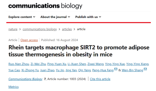 近日,bevitor伟德国际1946官网第一临床医学院尚文斌教授团队在国际著名Nature出版社旗下杂志Communications Biology(中科院生物学一区Top期刊)上发表有关中药大黄活性成分大黄酸减肥作用机制的最新研究成果:“Rhein targets macrophage SIRT2 to promote adipose tissue thermogenesis in obesity in mice”。