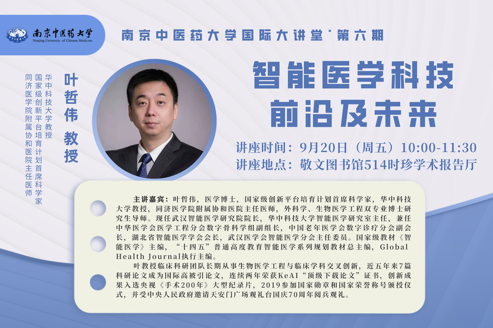 专家简介:叶哲伟,医学博士,国家级创新平台培育计划首席科学家,华中科技大学教授,同济医学院附属协和医院主任医师,外科学、生物医学工程双专业博士研究生导师。现任武汉智能医学研究院院长,华中科技大学智能医学研究室主任,兼任中华医学会医学工程分会数字骨科学组副组长,中国老年医学会数字诊疗分会副会长,湖北省智能医学学会会长,武汉医学会智能医学分会主任委员。国家级教材《智能医学》主编,“十四五”普通高度教育智能医学系列规划教材总主编,Global Health Journal执行主编。