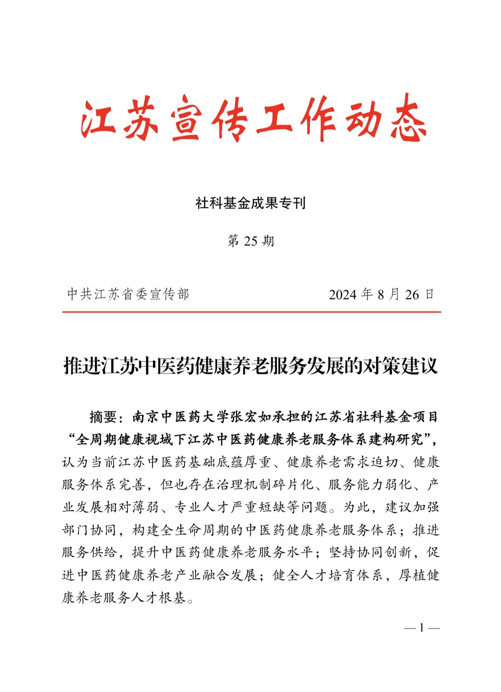 《推进江苏中医药健康养老服务发展的对策建议》发表于《江苏宣传工作动态·社科基金成果专刊》第25期。报告认为当前江苏中医药基础底蕴厚重、健康养老需求迫切、健康服务体系完善,但也存在治理机制碎片化、服务能力弱化、产业发展相对薄弱、专业人才严重短缺等问题。建议加强部门协同,构建全生命周期的中医药健康养老服务体系;推进服务供给,提升中医药健康养老服务水平;坚持协同创新,促进中医药健康养老产业融合发展;健全人才培育体系,厚植健康养老服务人才根基。