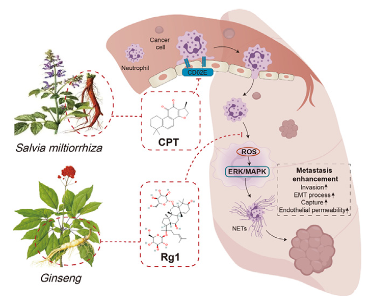 研究发现,人参和丹参联合使用在抑制中性粒细胞依赖的肿瘤血行转移方面具有协同效应。通过实验性肺转移模型发现,人参和丹参联合使用能够有效减少肺部肿瘤转移。RNA测序显示,这一效果可能与抑制肿瘤组织中中性粒细胞的募集有关。细胞粘附分子在调节中性粒细胞从血管向远端组织的迁移中起重要作用。分析显示,人参和丹参下调了关键细胞粘附分子E-选择素(E-selectin, CD62E)的表达,尤其是在丹参的作用下,CD62E的表达显著减少。进一步从丹参中筛选出隐丹参酮能够抑制TNF-α诱导的CD62E表达,降低中性粒细胞与内皮细胞的粘附,减少中性粒细胞募集到肿瘤部位。鉴于肿瘤细胞在肿瘤转移中的重要作用,研究团队进一步分离肺组织中性粒细胞进行RNA测序,发现人参和丹参减少转移灶NETs的形成。并且筛选出人参皂苷Rg1能够抑制PMA诱导的NETs形成,从而降低了NETs对肿瘤细胞的侵袭、粘附和上皮间质转化的作用,维持了血管完整性。此外,人参皂苷Rg1与隐丹参酮联合使用展现了显著的抗肿瘤转移效果,且具有一定的安全性。有望为原创性抑制肿瘤转移复发的创新中药提供重要的支持,造福癌症患者,