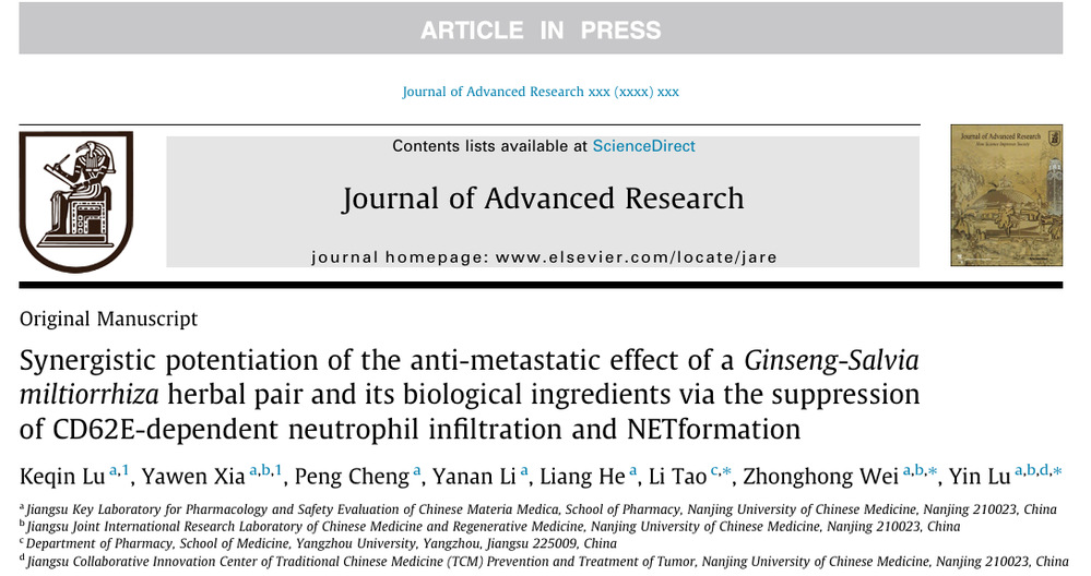 伟德药学院陆茵教授课题组长期围绕活血化瘀中药对肿瘤转移是促进还是抑制这个一直困扰中医临床临床的科学问题开展研究,前期已经取得重要的积淀。今年,2024年10月29日在Journal of Advanced Research杂志(IF=11.4,中科院一区)在线发表题为“Synergistic potentiation of the anti-metastatic effect of a Ginseng-Salvia miltiorrhiza herbal pair and its biological ingredients via the suppression of CD62E-dependent neutrophil infiltration and NET formation”的研究论文,从大量的中药复方中发现来源于丹参-人参的组分配伍(隐丹参酮+人参皂苷Rg1)协同抑制肿瘤血行转移过程中NETs介导的癌栓形成关键环节,其深入的分子机制研究丰富了活血化瘀抗肿瘤血行转移的科学内涵,为临床活血化瘀药配伍抑制肿瘤转移提供重要的支撑,为抗肿瘤转移中药新药的研制提供了理论和实验依据。