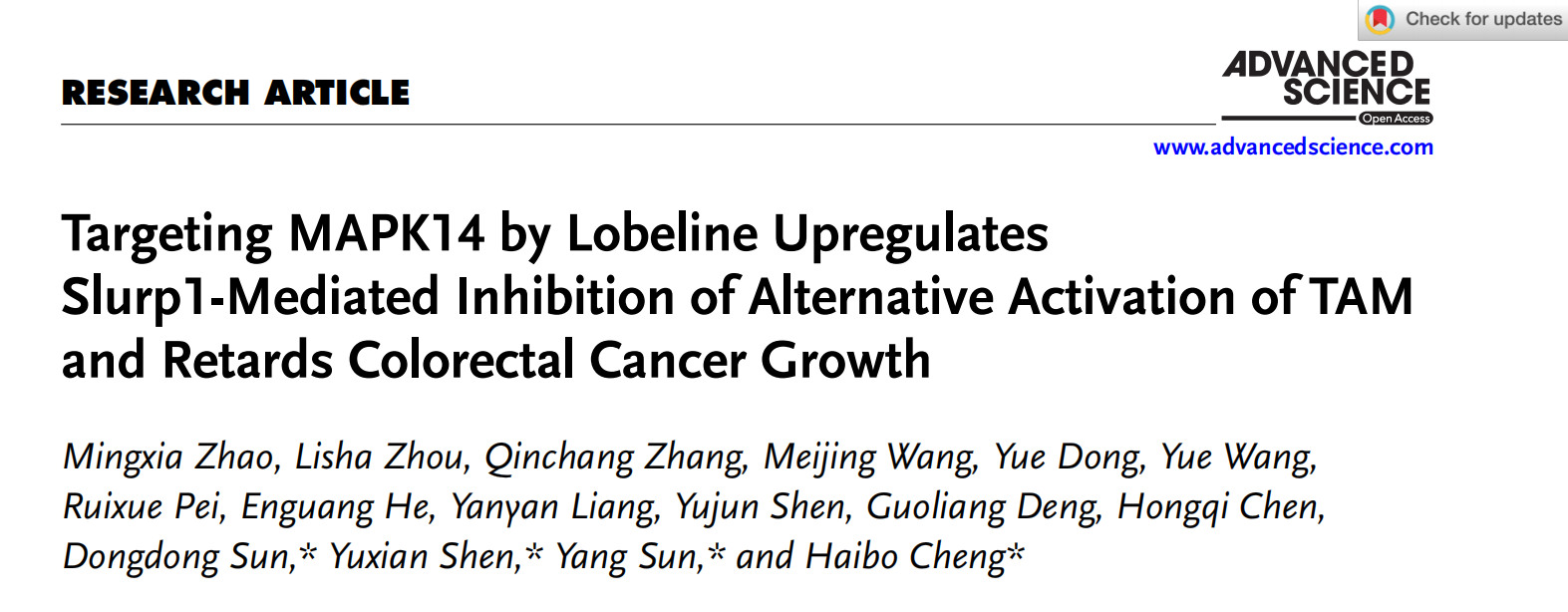 2025年1月22日,bevitor伟德国际1946官网程海波/孙东东教授团队,联合南京大学孙洋教授团队、安徽医科大学沈玉先教授团队在国际知名学术期刊Advanced Science(Adv Sci,Q1,IF=14.3)在线发表了题为Targeting MAPK14 by Lobeline Upregulates Slurp1-Mediated Inhibition of Alternative Activation of TAM and Retards Colorectal Cancer Growth的最新研究成果。