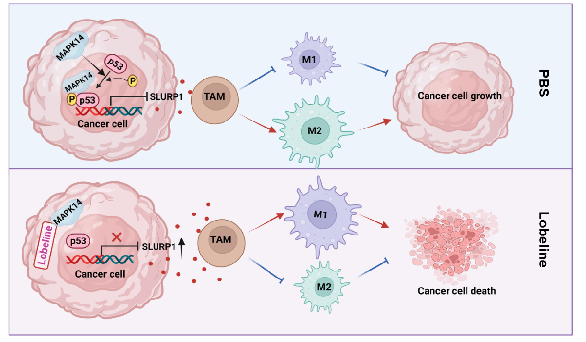 研究人员首先在结直肠癌CRC荷瘤小鼠与人CRC类器官上探究了Lobeline的抑瘤活性,接着运用scRNA-seq技术解析Lobeline抗肿瘤的作用机制,发现Lobeline促进TAM向M1样TAM极化,并抑制它们向M2样TAM极化;使用TRAP技术寻找Lobeline的靶标蛋白,通过ITC、分子对接、定点突变证实MAPK14是Lobeline的作用蛋白。采用敲低和过表达实验,结合荧光素酶检测等技术手段,发现Lobeline 靶向MAPK14,阻止其核易位,降低磷酸化p53水平,增强SLURP1转录,通过MAPK14/p53/Slurp1信号通路调节TAMs极化。最后,研究人员将Lobeline和PD-1抗体联用,发现较接受Lobeline或PD-1抗体单一治疗的小鼠表现出更好的抗肿瘤效果,同时联合治疗组M1巨噬细胞上调,M2巨噬细胞下调。上述研究表明,使用Lobeline重塑免疫抑制微环境可能是一种很有前途的CRC治疗策略。