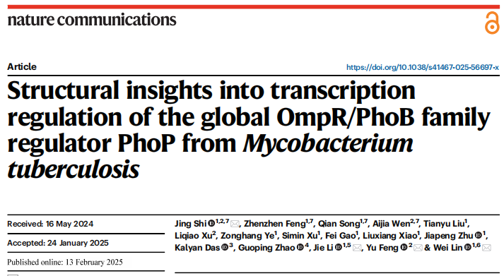 2025年2月13日,bevitor伟德国际1946官网医学院,鼓楼临床医学院林炜教授团队、鼓楼临床医学院感染科李婕教授团队、浙江大学医学院冯钰教授团队合作在Nature子刊Nature Communications杂志上发表了题为Structural insights into transcription regulation of the global OmpR/PhoB family regulator PhoP from Mycobacterium tuberculosis的研究成果。该研究解析了结核分枝杆菌毒力因子PhoP与靶标基因启动子DNA及RNA聚合酶的复合物电镜结构,揭示了PhoP灵活调控磷源、氮源压力应激基因转录的双重转录调控机制,为全面认识结核分枝杆菌在宿主体内的逆境生存调控机制奠定了基础,该研究是林炜教授团队继Mol. Cell(2017, 2018)、Nat Commun(2019)、Nucleic Acids Res(2020, 2021, 2022a, 2022b)、PNAS(2023)、iScience(2024)之后在病原微生物基因转录调控机制研究和新型抗感染药物靶标发现领域取得的又一项系统性创新成果。