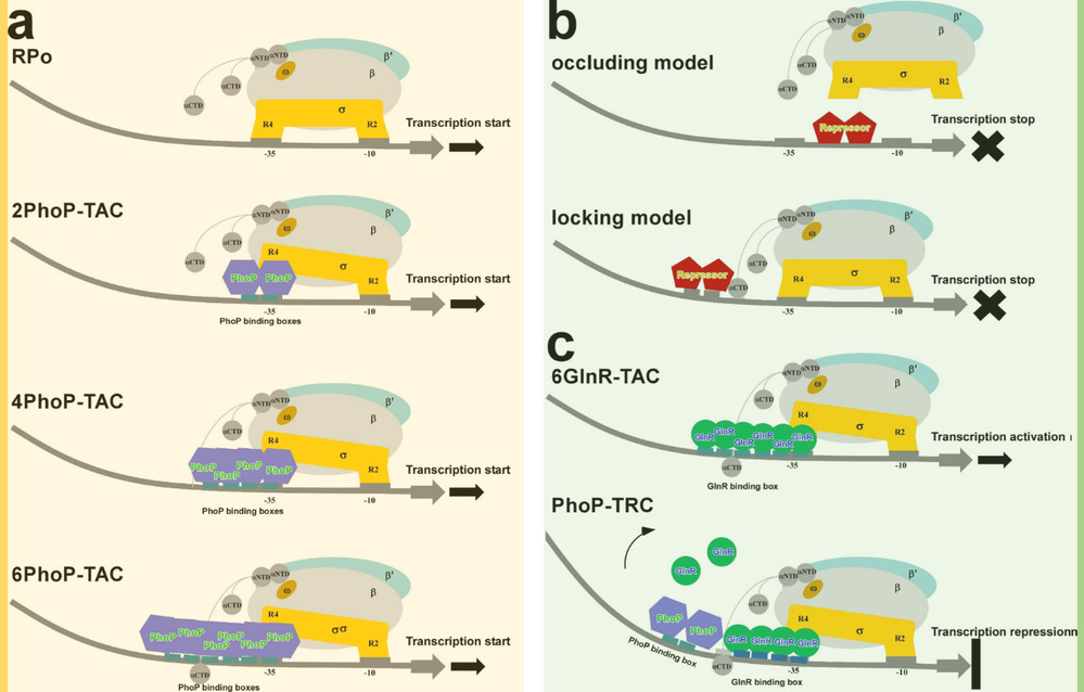 本研究运用冷冻电镜技术解析了三种结核分枝杆菌全局性调控蛋白PhoP依赖型转录激活复合物(PhoP-TACs)的结构,并构建了一种PhoP依赖型转录抑制复合物(PhoP-TRC)的调控模型,揭示了PhoP如何与启动子DNA、RNA聚合酶作用双重调控下游基因转录的分子机制。在PhoP-TACs中,PhoP的C端DNA结合结构域可分别首尾相连串联成二聚体、四聚体或六聚体的方式特异识别启动子DNA上的相应结合位点(PHO box),PhoP的N端应答结构域通过与RNA聚合酶的保守结构域广泛相互作用而进一步稳定复合物结构,促进转录起始。在PhoP-TRC中,一个PhoP二聚体通过PhoP-PHO box、PhoP-GlnR和αCTD-DNA 相互作用竞争性结合启动子DNA上游的GlnR结合位点,并显著扭转DNA。PhoP 通过这种独特结合产生的空间位阻效应阻止额外GlnR分子的结合,进而发挥“竞争性抑制”转录的作用。该研究系统揭示了结核分枝杆菌PhoP依赖型双重转录调控机制及共性调控元件,深化了对结核分枝杆菌磷源、氮源饥饿压力应激调控的认识,可为抗结核潜伏感染药物研发提供新靶标和新思路。