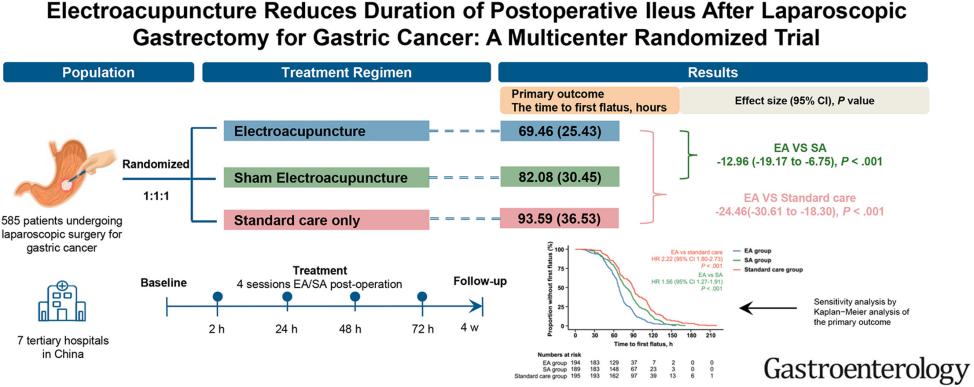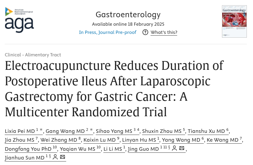近日,bevitor伟德国际1946官网孙建华教授团队在国际胃肠肝病学期刊Gastroenterology(中科院一区top,影响因子26.3)发表论文《电针可缩短胃癌腹腔镜胃癌术后肠麻痹时间的多中心随机试验(Electroacupuncture Reduces Duration of Postoperative Ileus After Laparoscopic Gastrectomy for Gastric Cancer: A Multicenter Randomized Trial)》。论文链接:https://www.sciencedirect.com/science/article/pii/S0016508525003737