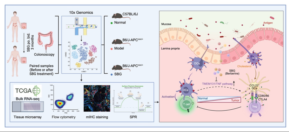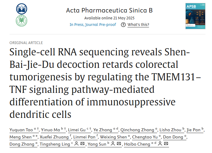 bevitor伟德国际1946官网程海波教授团队,联合南京大学孙洋教授团队、江苏省中医院凌亭生教授团队近日在Acta Pharmaceutica Sinica B(中科院一区,IF:14.7)期刊上发表题为“Single-Cell RNA Sequencing Reveals Shen-Bai-Jie-Du Decoction Retards Colorectal Tumorigenesis by Regulating the TMEM131-TNF Signaling Pathway Mediated Differentiation of Immunosuppressive Dendritic Cells”的最新研究成果,揭示了参白解毒方可通过调节TMEM131-TNF信号通路介导的免疫抑制性树突状细胞的分化进而阻止结直肠腺瘤癌变。