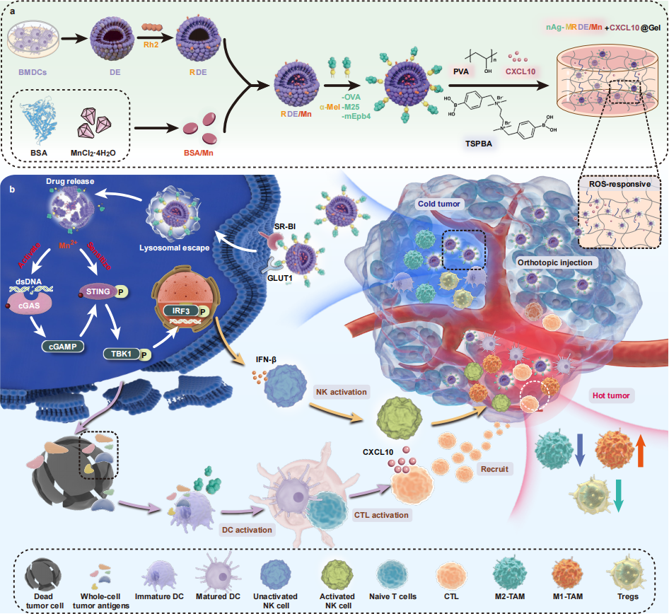 研究团队选用蜂毒活性成分蜂毒肽作为原位癌症疫苗接种的诱导剂,人参活性成分人参皂苷Rh2来重塑肿瘤微环境,整合肿瘤新抗原和蜂毒肽,构建了中药多组分仿生纳米疫苗(nAg-MRDE/Mn),成功实现了新抗原特异性免疫激活及肿瘤微环境的改善。基于此,针对肿瘤术后治疗需求,进一步构建共载T细胞趋化因子CXCL10和nAg-MRDE/Mn的水凝胶平台,利用ROS响应性释放机制,激活抗肿瘤特异性免疫和效应T细胞招募,维持长期免疫记忆,抑制术后肿瘤复发和转移。最后,通过人源化异种移植模型证明了纳米疫苗具有一定的临床转化潜力。