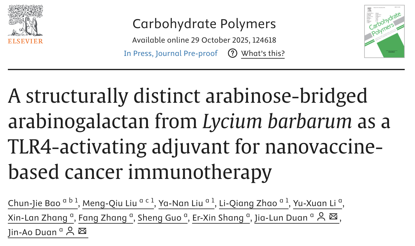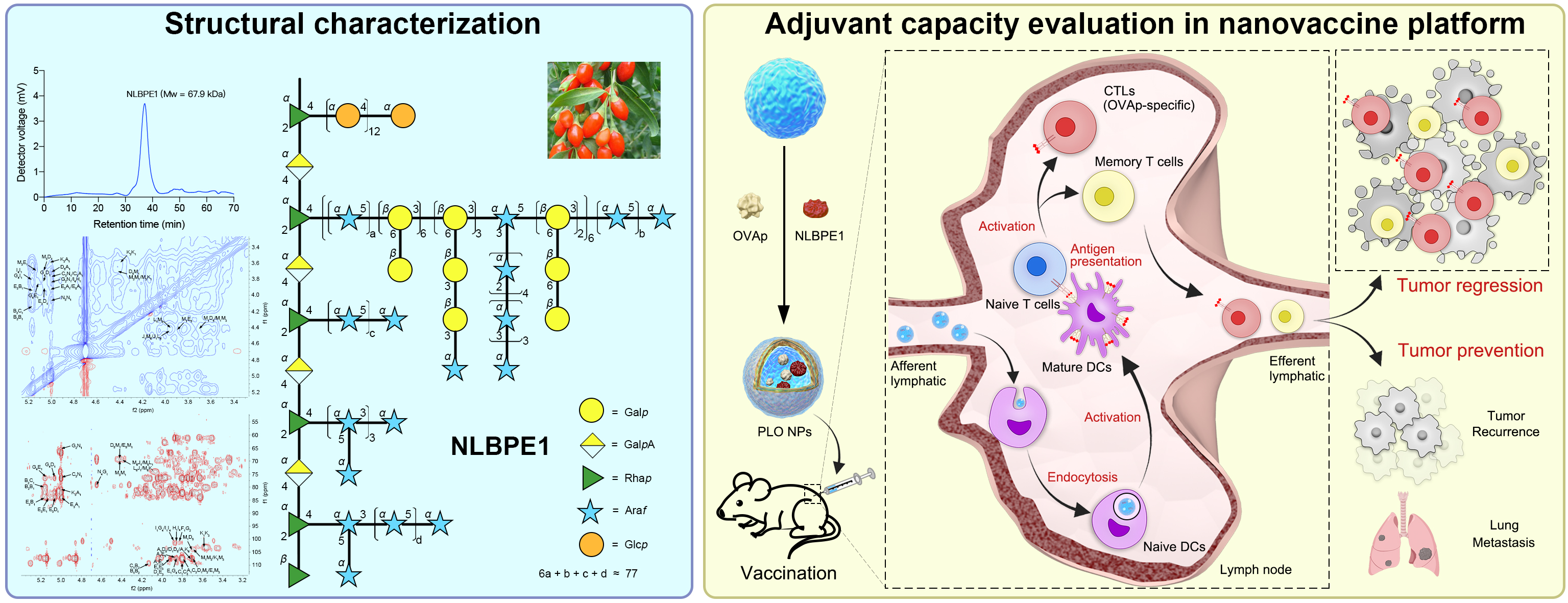 10月29日,伟德江苏省中药资源产业化过程协同创新中心段金廒教授/段嘉伦副教授团队在国际学术期刊Carbohydrate Polymers(中科院一区,IF:12.5)期刊上在线发表了题为A structurally distinct arabinose-bridged arabinogalactan from Lycium barbarum as a TLR4-activating adjuvant for nanovaccine-based cancer immunotherapy的研究工作。该研究首次从枸杞子中分离并解析了一种均一化多糖NLBPE1,揭示了其作为疫苗佐剂在肿瘤免疫治疗中的应用潜力。