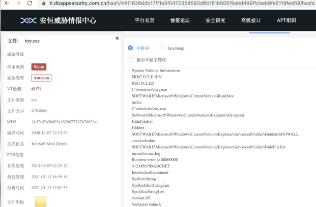 实际上样本已经存在很久,从安恒威胁情报中心平台上观察样本至少在14年就已经存在。