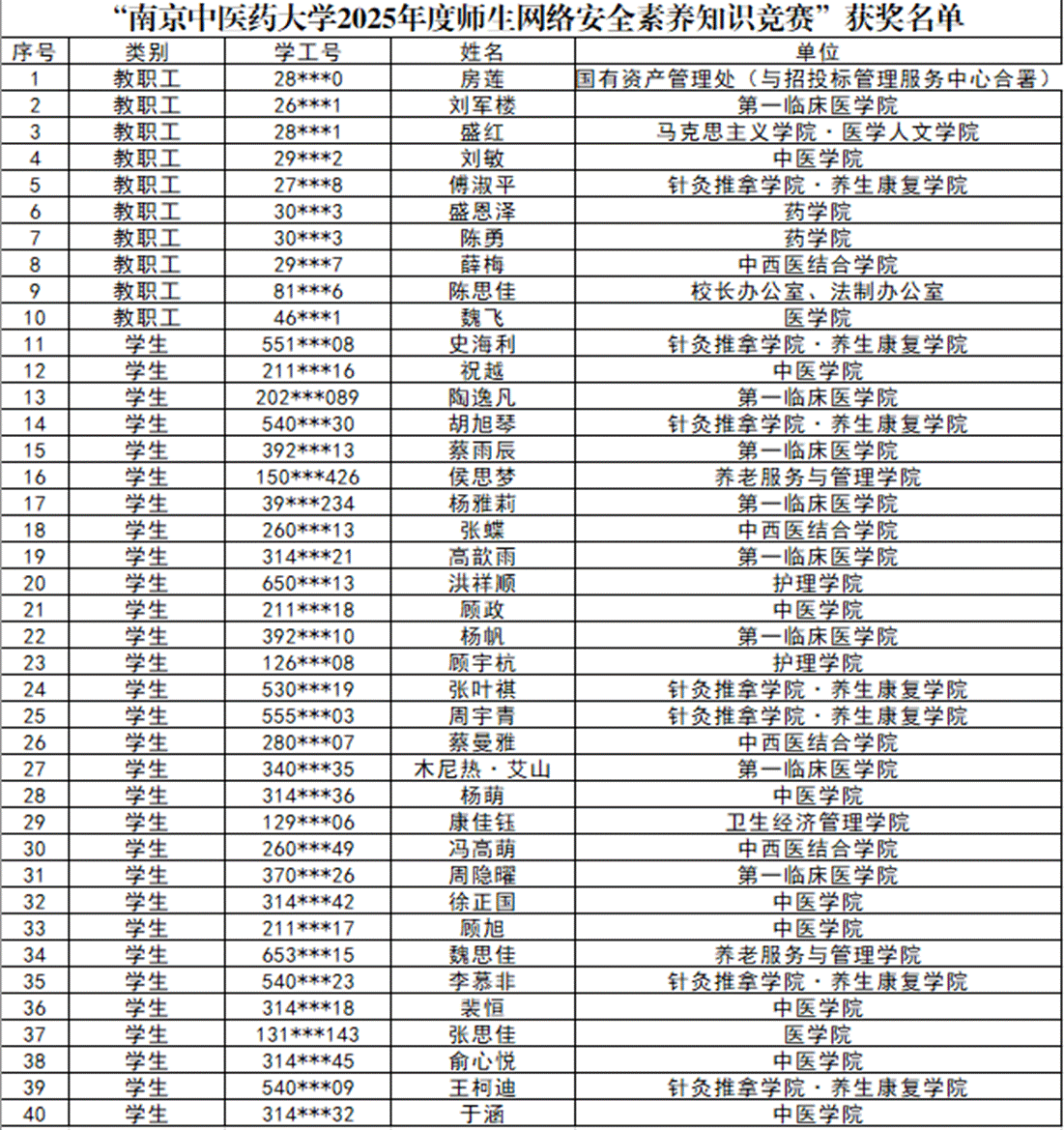 为深入贯彻《省教育厅办公室关于开展2025年江苏省教育系统网络安全宣传周校园日活动的通知》精神,进一步增强师生网络安全意识,提升网络安全防护技能,伟德成功举办了2025年度网络安全素养知识竞赛。本次竞赛根据答题得分(大于等于80)随机抽取出获奖者40名(学生30名,教职工10名),现将本次竞赛获奖名单(见下文)予以公布,获奖者请于9月28日前工作时间内至图书馆112室现场领取奖品。